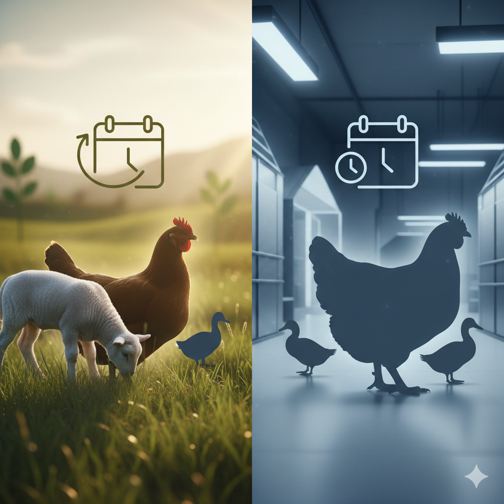 Not all proteins are raised the same. Conventional poultry often reaches market weight in ~42–45 days, while slow-growing birds take longer—time that supports more natural development and better welfare outcomes. That difference matters because ingredient quality starts long before we dehydrate anything.